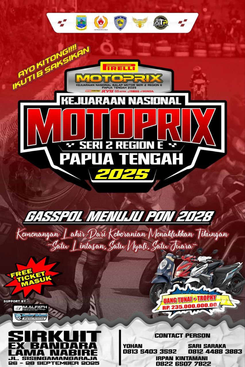 Papua Tengah Motor Club (PTMC) siap menjalankan Kejurnas Motoprix bersama Pemprov Papua Tengah dan KONI Papua Tengah dengan dukungan IMI Pusat. Dengan tagline “Gasspol Menuju PON 2028”, bukan saja mencari bibit atlit balap motor provinsi Papua Tengah yang handal nantinya.
