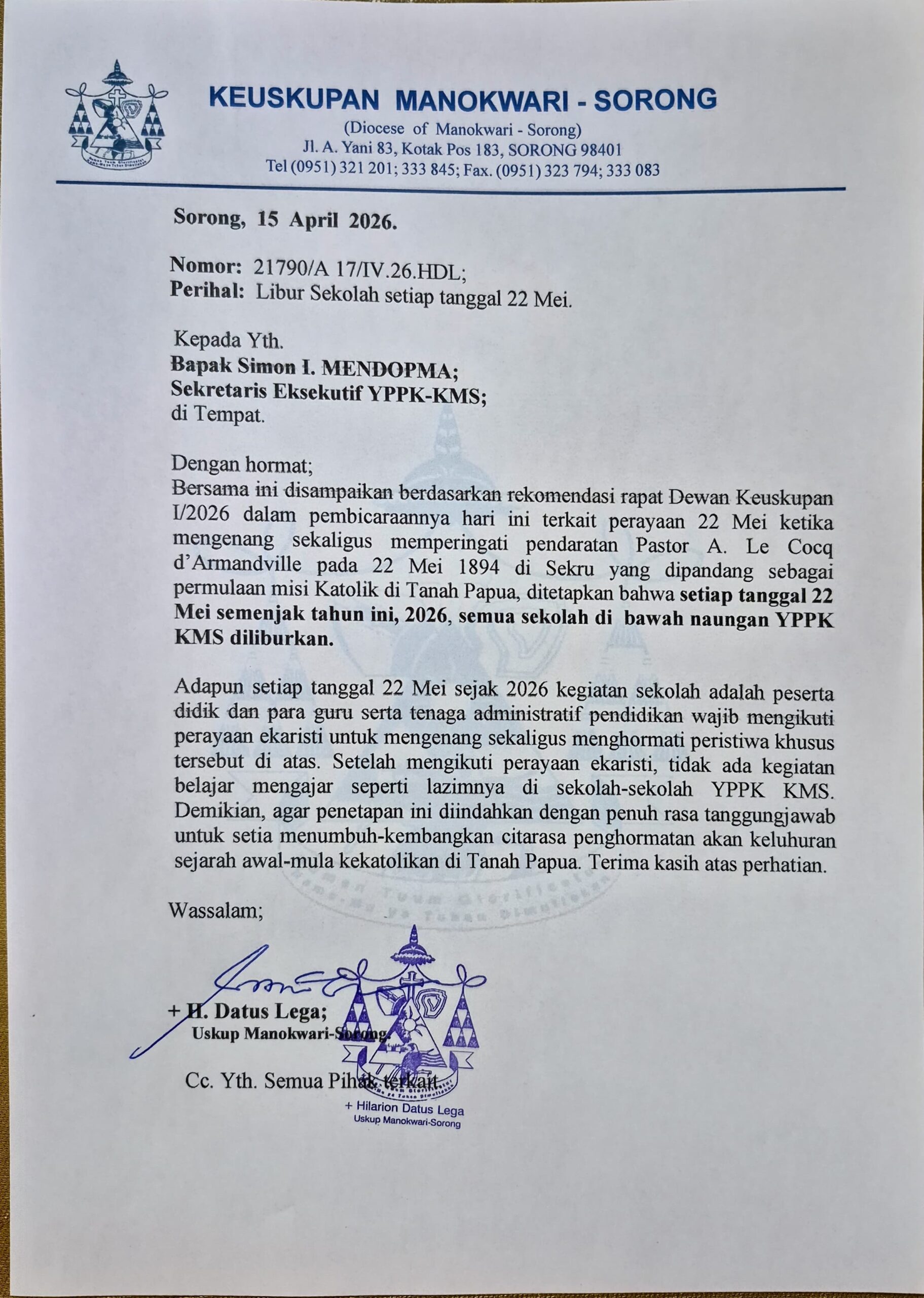 “Kami Tim Kerja Dapur Harapan menyampaikan apresiasi kepada Bapa Uskup Manokwari – Sorong. Melalui kebijakan ini, setiap tanggal 22 Mei mulai tahun 2026, seluruh sekolah di bawah naungan YPPK KMS diliburkan, dan peserta didik, guru, serta tenaga kependidikan diarahkan untuk mengikuti perayaan Ekaristi sebagai bentuk penghormatan terhadap sejarah awal Gereja Katolik di Tanah Papua,” kata Yan Ukago, Senin, (20/4/2026).